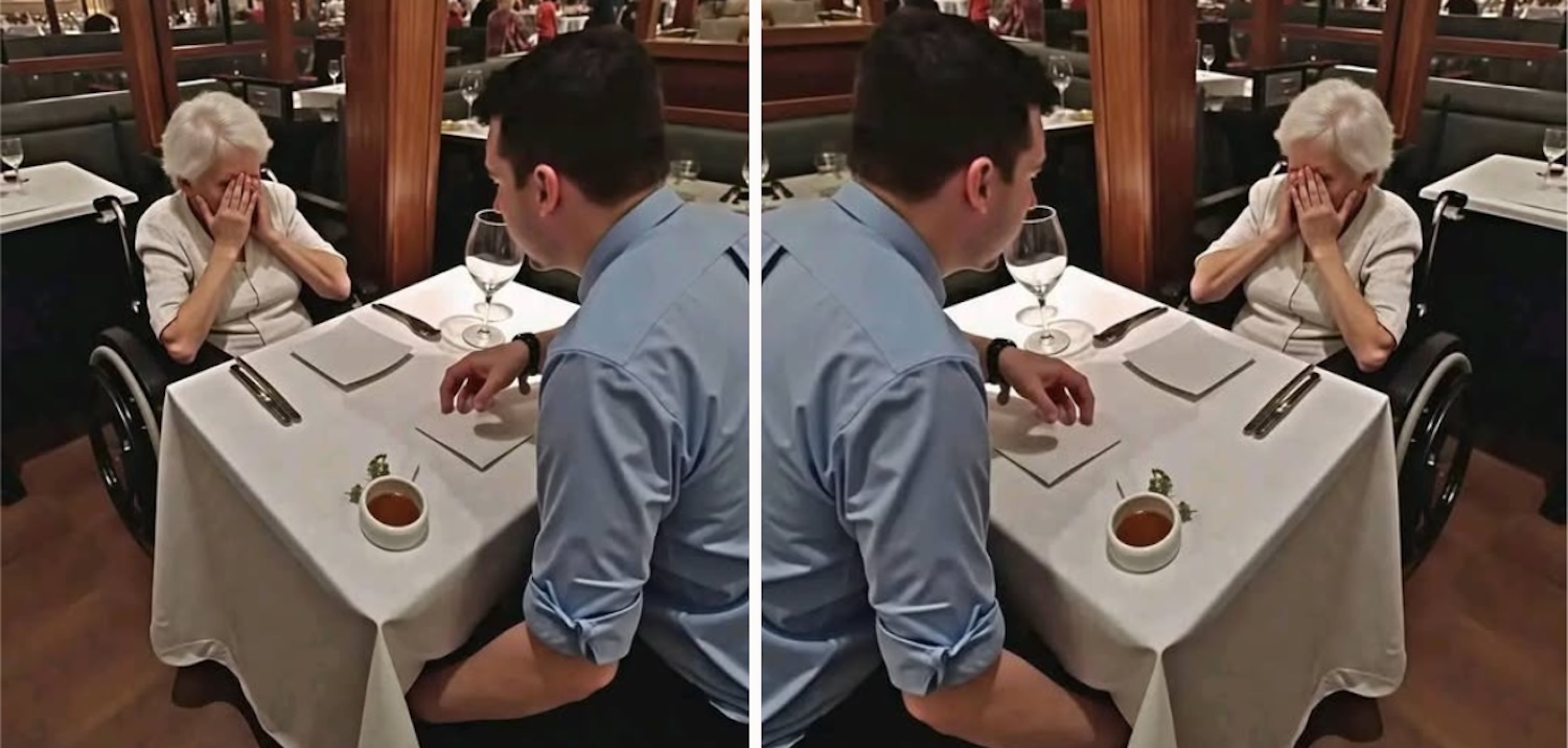 Aan een tafel in het midden zat een oudere vrouw in een rolstoel. Haar handen trilden terwijl ze haar kalmte probeerde te bewaren. Ze fluisterde zachtjes: “Het spijt me, meneer… hij bedoelde het niet zo.” Ondanks de kwetsing straalde ze bezorgdheid uit — niet voor zichzelf, maar voor haar zoon. Ze wilde de spanning sussen, de ongemakkelijkheid verminderen. Haar houding toonde een zeldzame vorm van liefde: onvoorwaardelijk, zelfs in pijnlijke momenten.