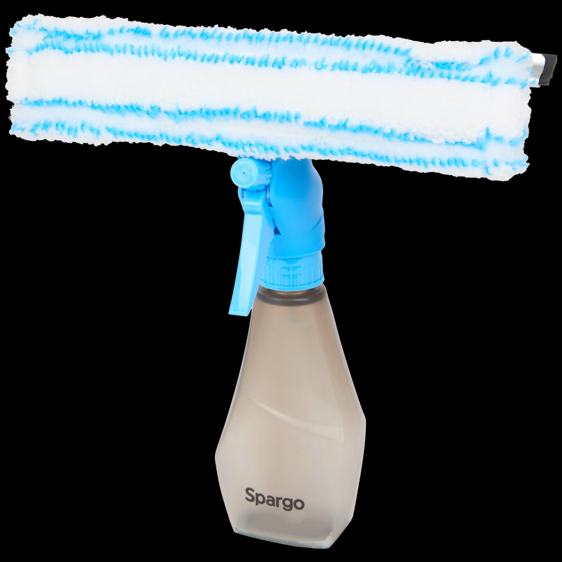 De raamwisser heeft een handvat dat tegelijk fungeert als waterreservoir. In dat handvat zit een geïntegreerde sproeier, zodat je direct op het raam kunt sprayen zonder losse fles. Bovenop zit de rubberen trekker, stevig genoeg om het water goed mee te nemen.