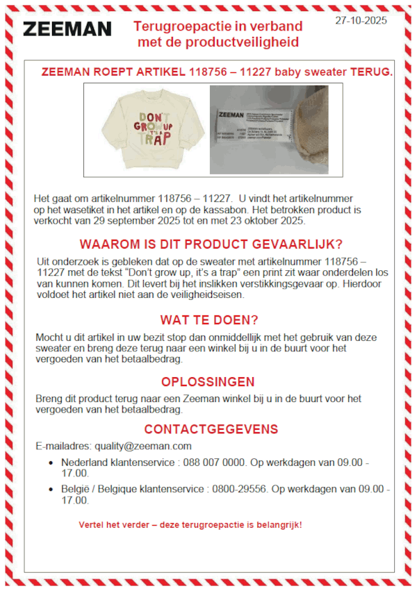 De bekende textielketen Zeeman roept een populaire babysweater terug vanwege een mogelijk verstikkingsgevaar. Ouders worden dringend verzocht het kledingstuk niet meer te gebruiken. Het gaat om een trui met de opdruk “Don’t grow up, it’s a trap”, waarvan delen van de print kunnen loslaten. Als een kind deze onderdelen in de mond stopt, kan dat leiden tot ernstig risico op verstikking.